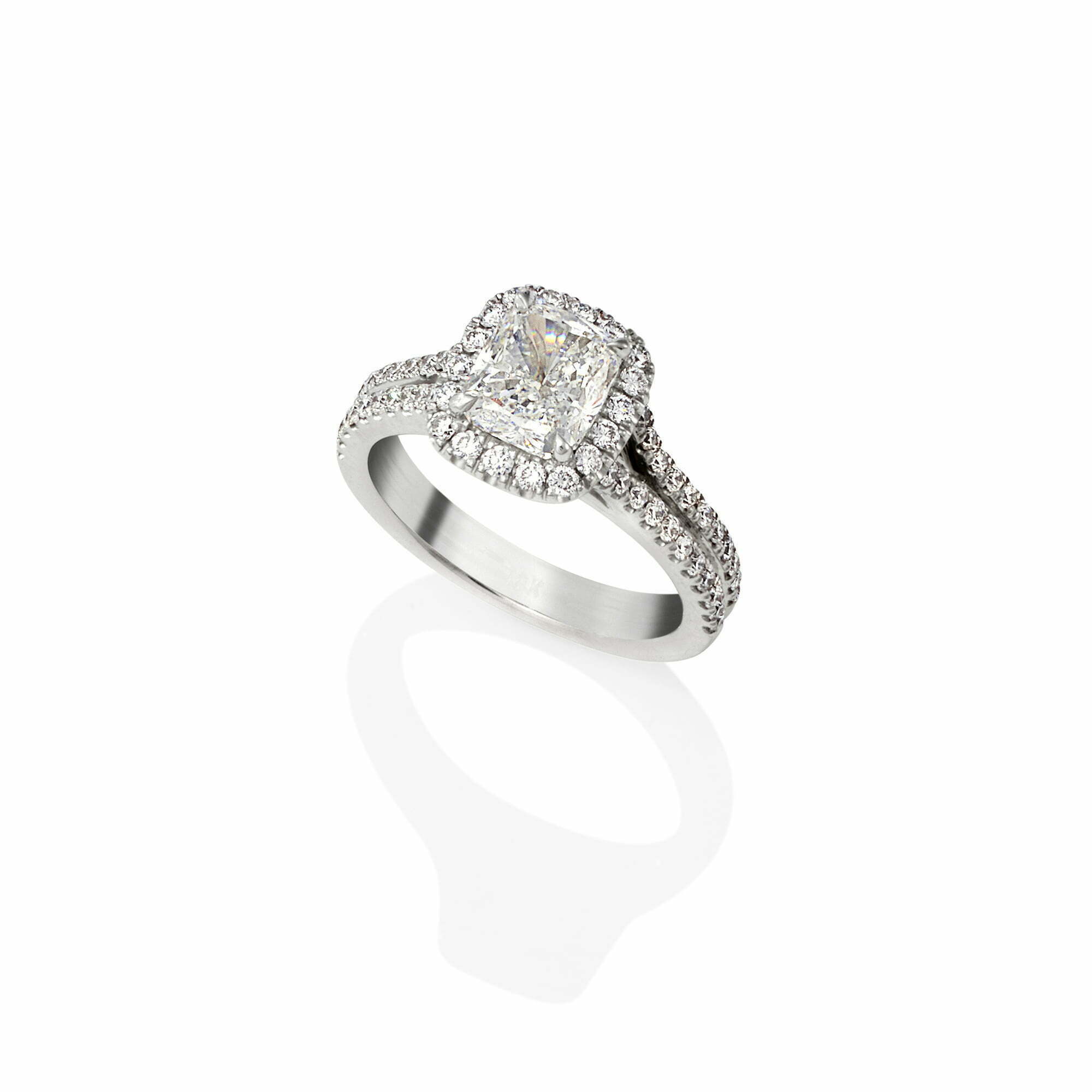 18ct white gold diamond ring, featuring a cushion cut internally flawless diamond, in a cut claw set halo. The double…