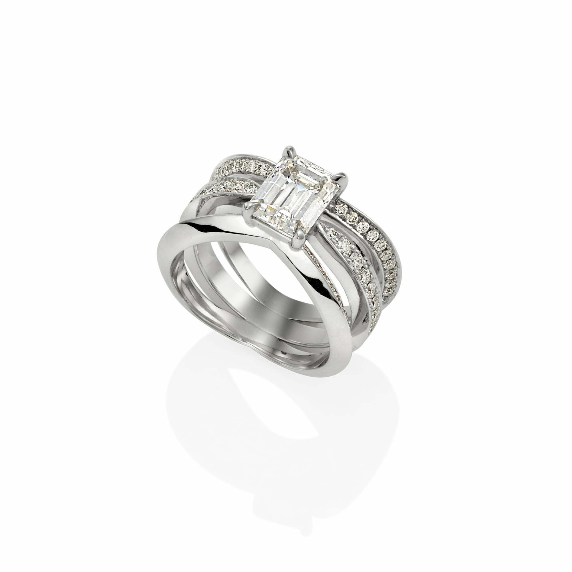 Platinum ring, featuring a centre 4 claw set emerald cut diamond. The band is split into three curved sections with…