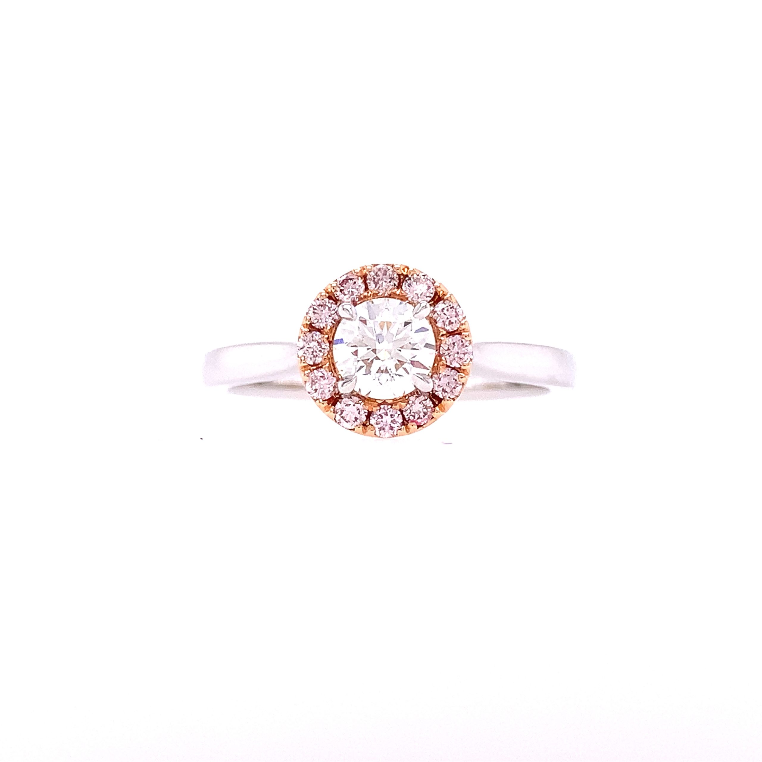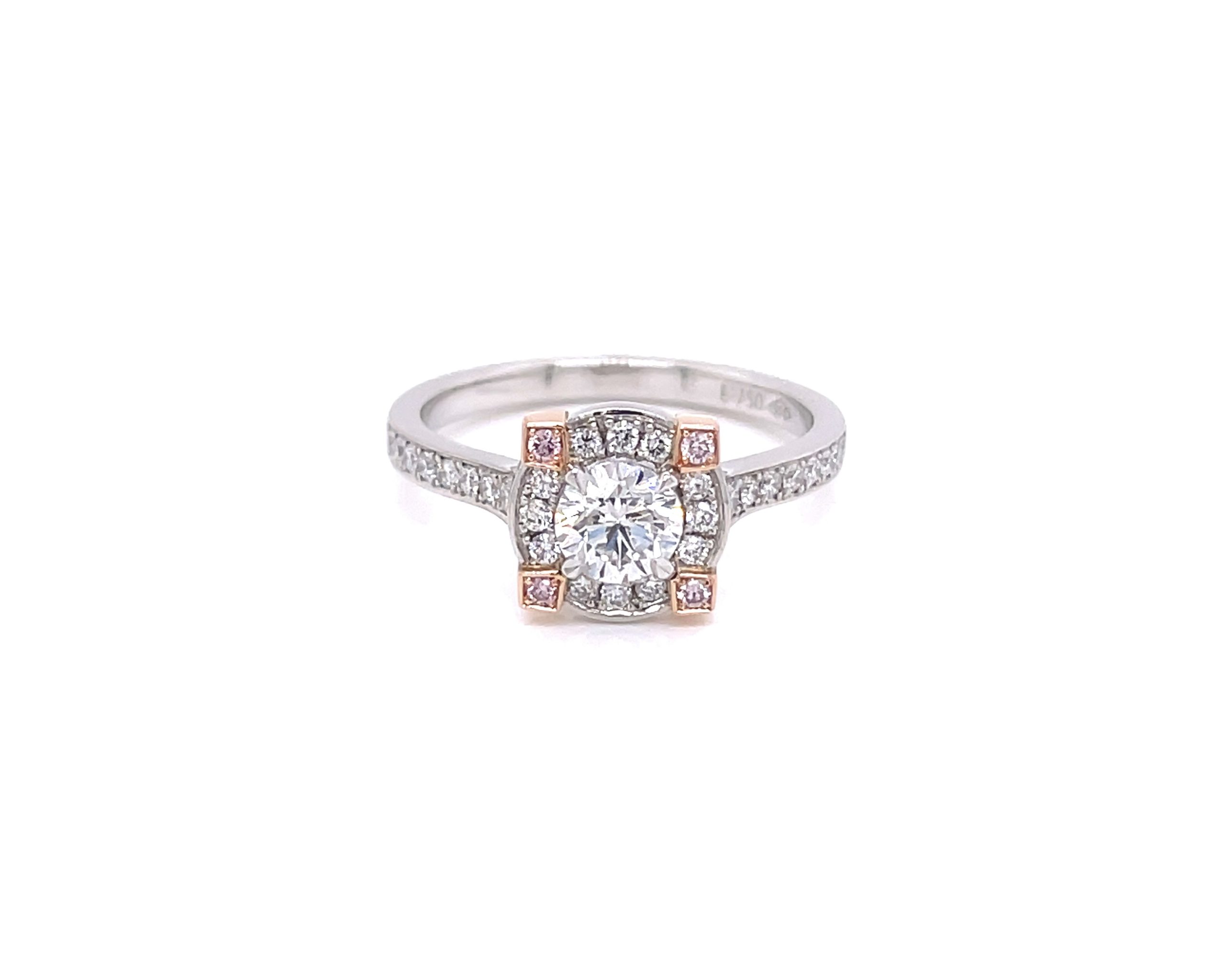 Platinum and 18ct rose gold diamond ring, featuring a claw set Argyle round brilliant cut white diamond that is surrounded…