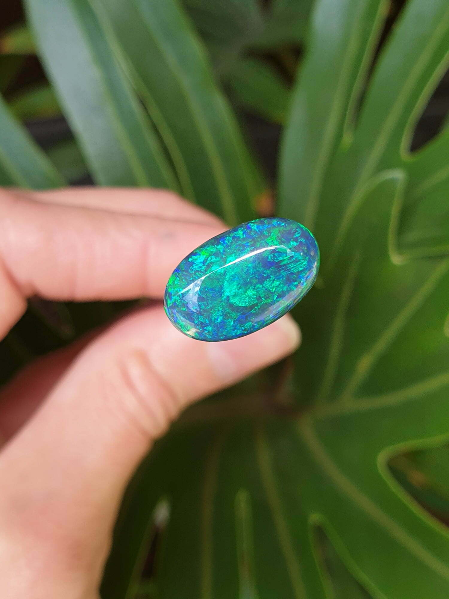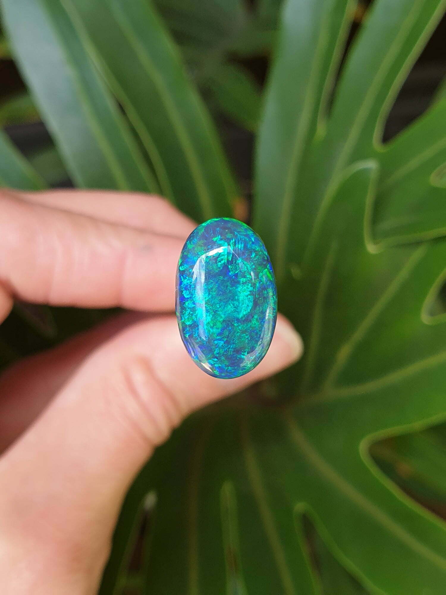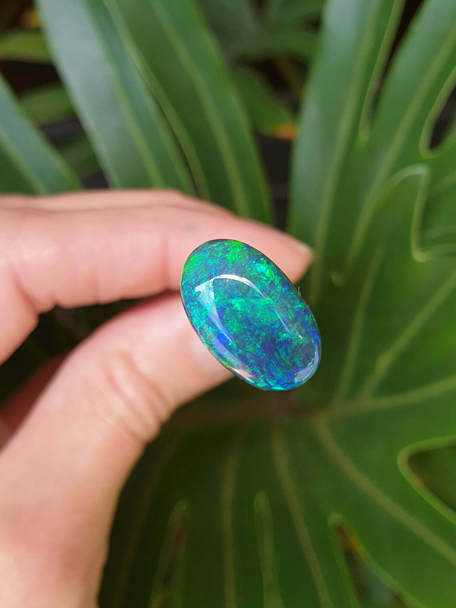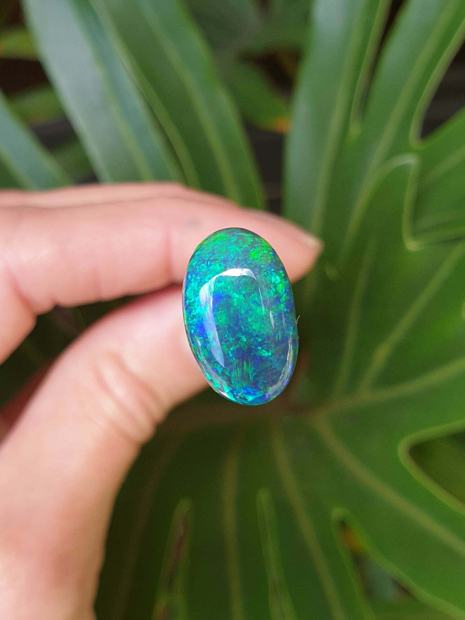 A natural Australian black opal with vivid and bright blue-green play of colour.