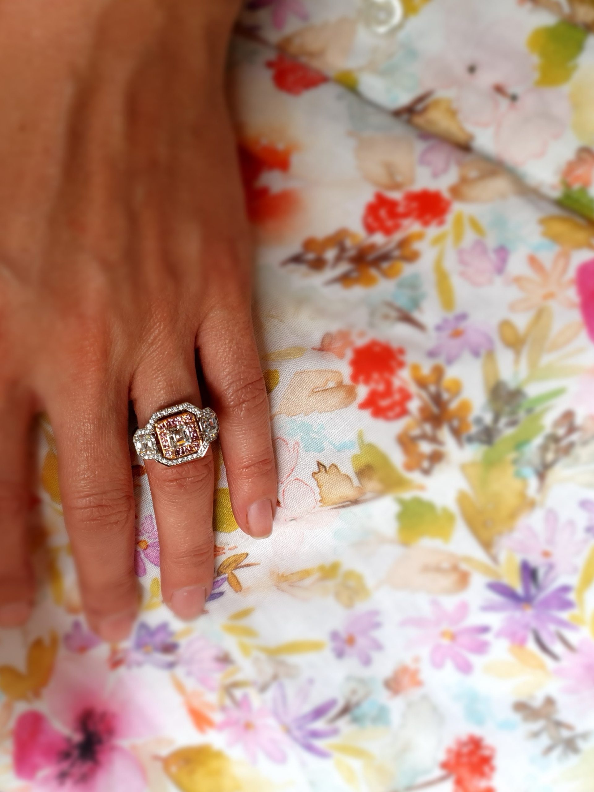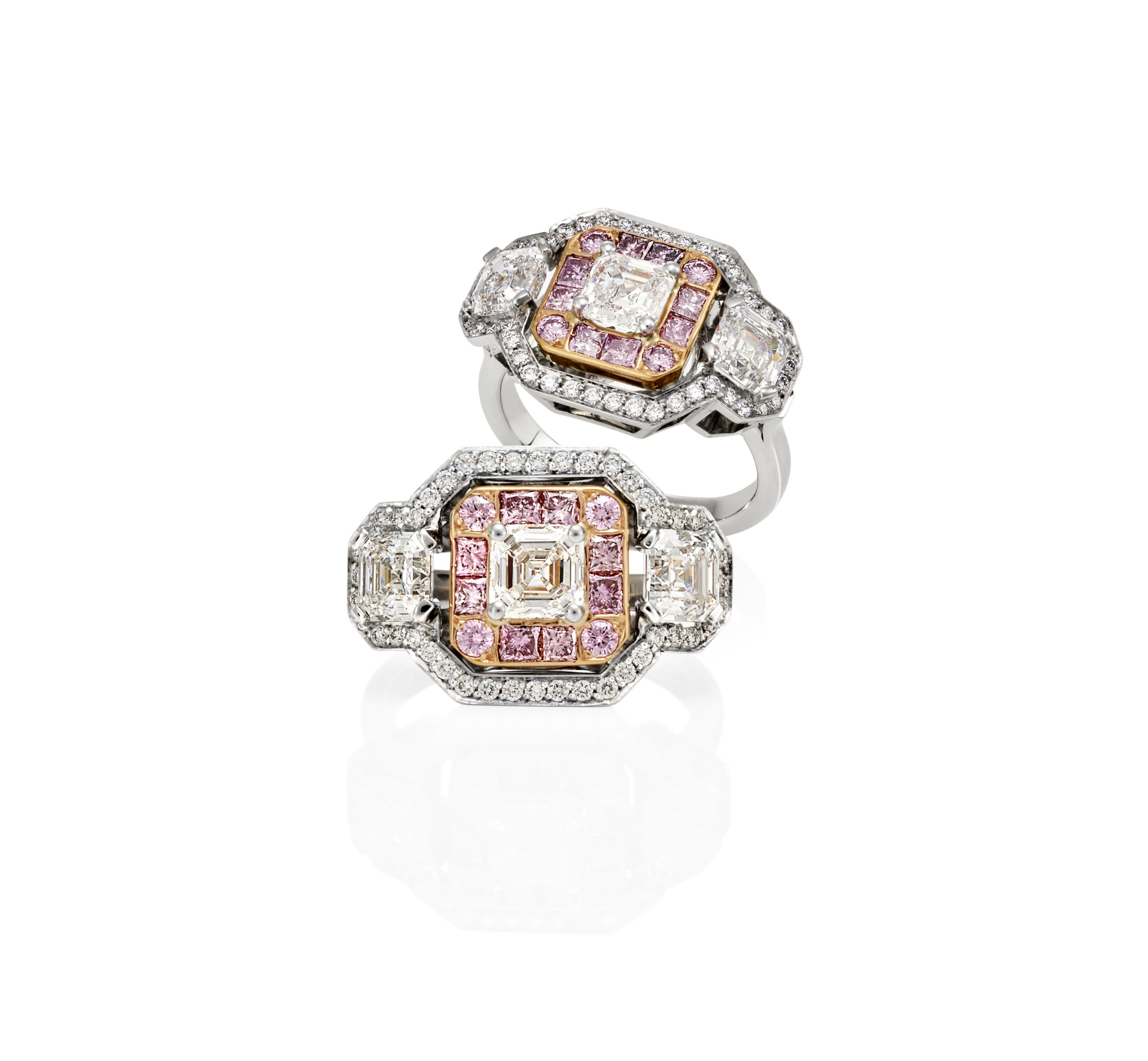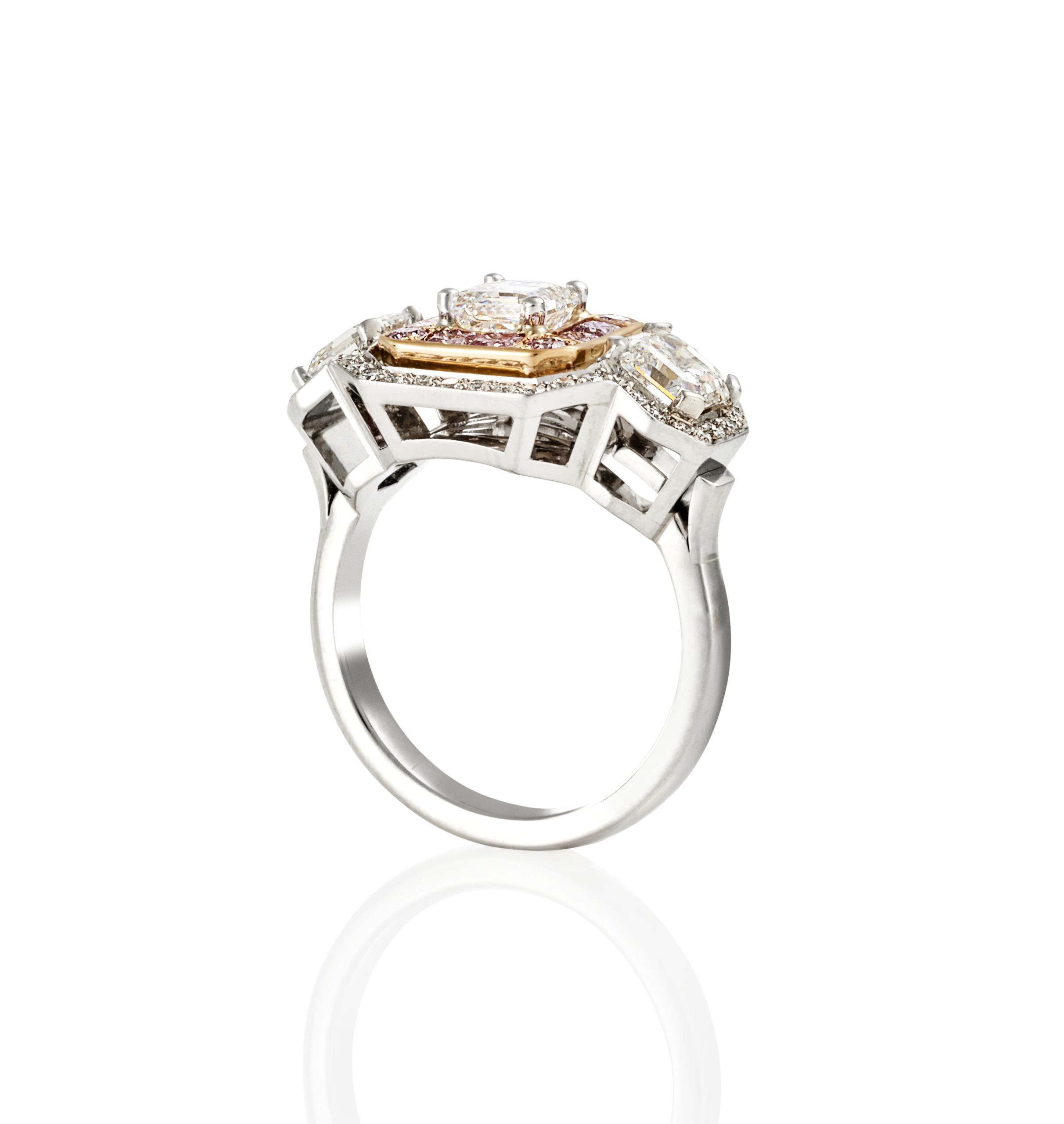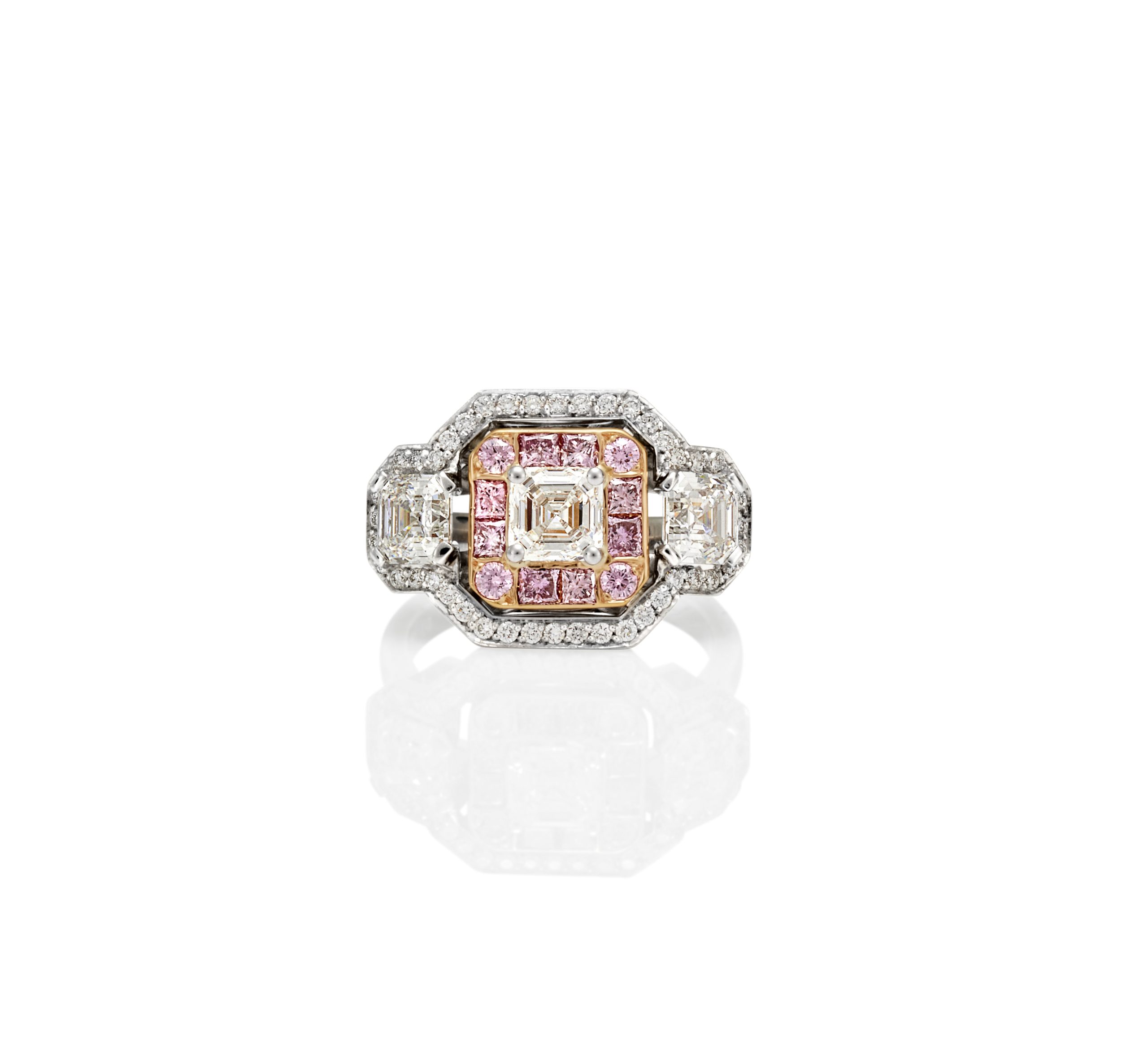 A stunning platinum and diamond ring featuring three square emerald cut diamonds in platinum 4 claw settings. The centre diamond is surrounded by a halo of round and princess cut Argyle pink diamonds, in an 18ct rose gold frame. A second halo of round white diamonds encases the trio in platinum. The band is upswept and has a soft rounded profile.