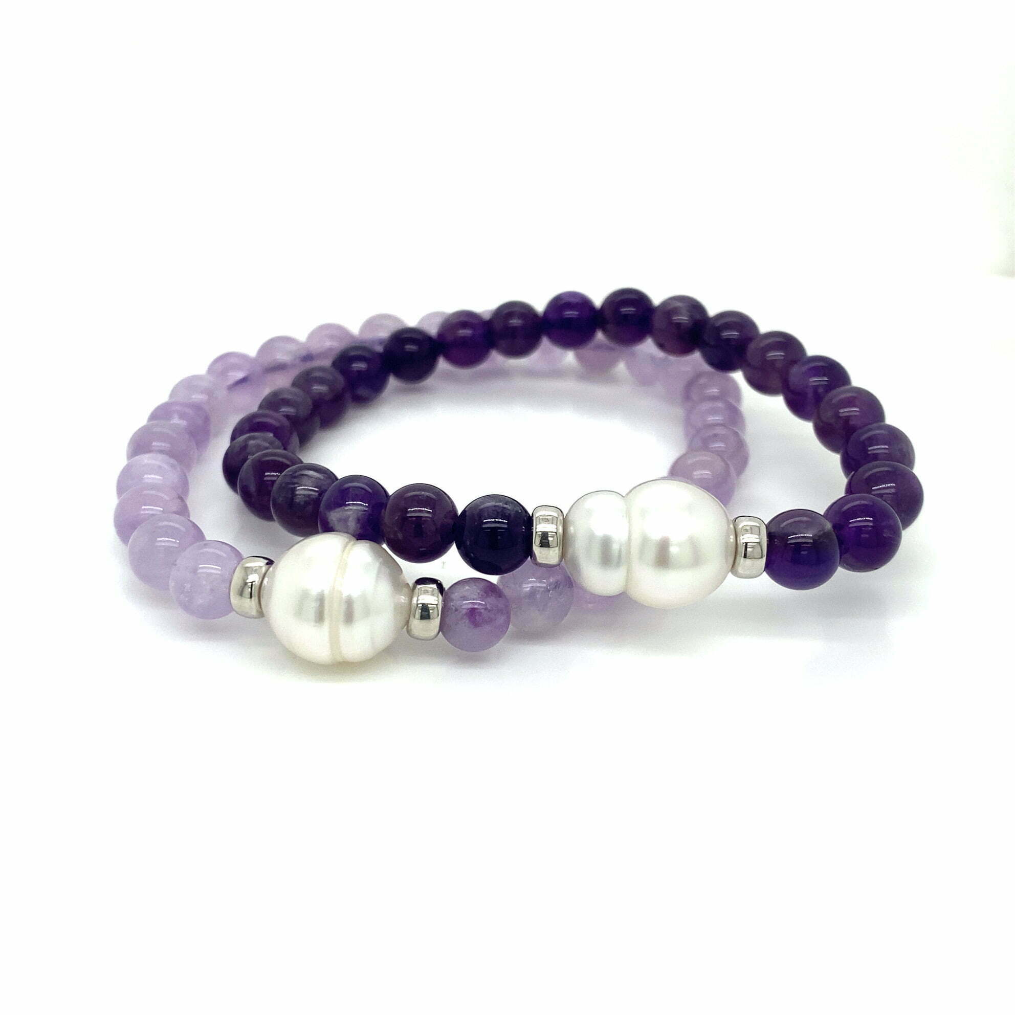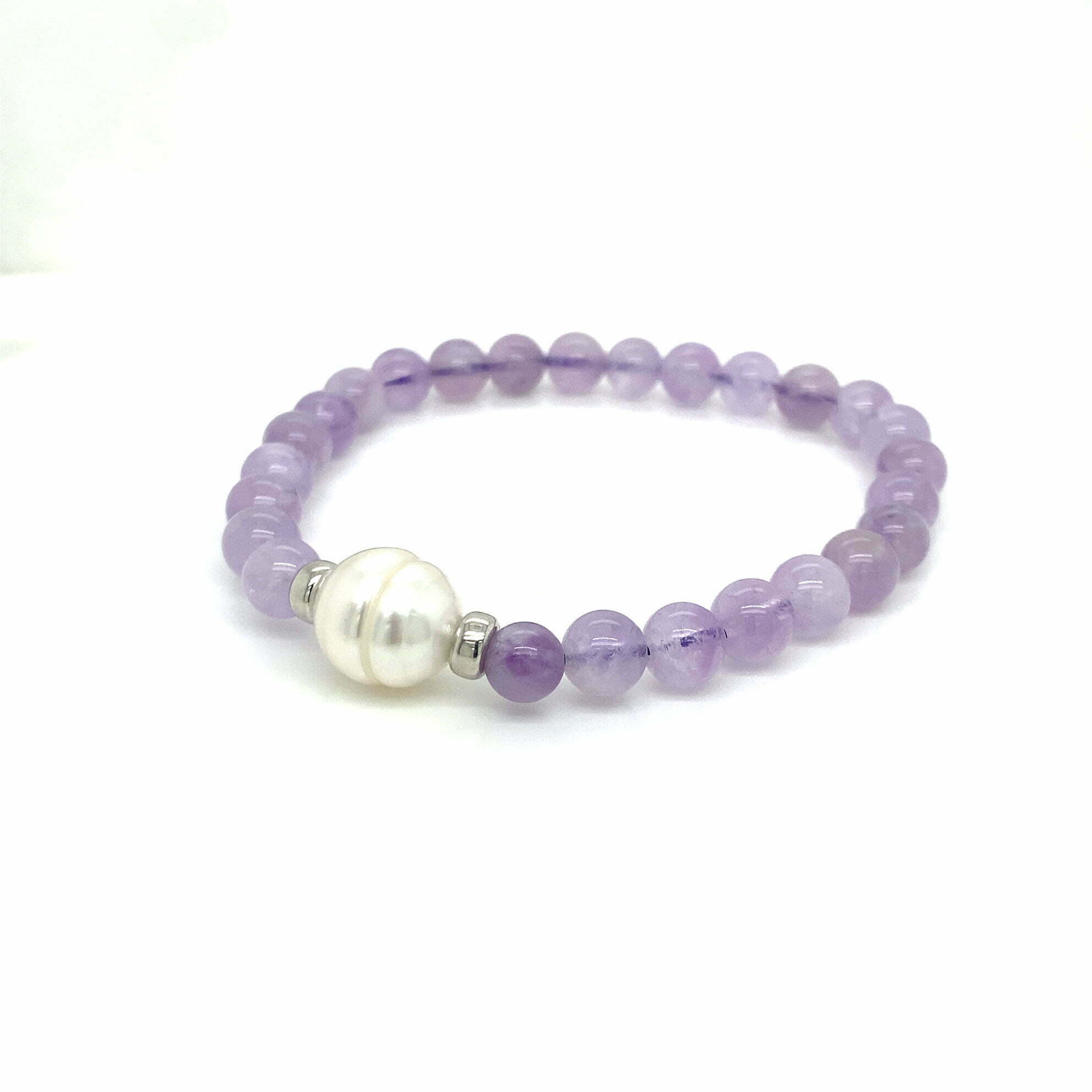 One 11mm Australian South Sea cultured pearl with two 14ct white gold rondels and polished round lavender amethyst beads. The bracelet is strung on multiple strands of strong pale purple elastic. Bracelets can be made to order in different sizes and colours, please contact us to find out more.