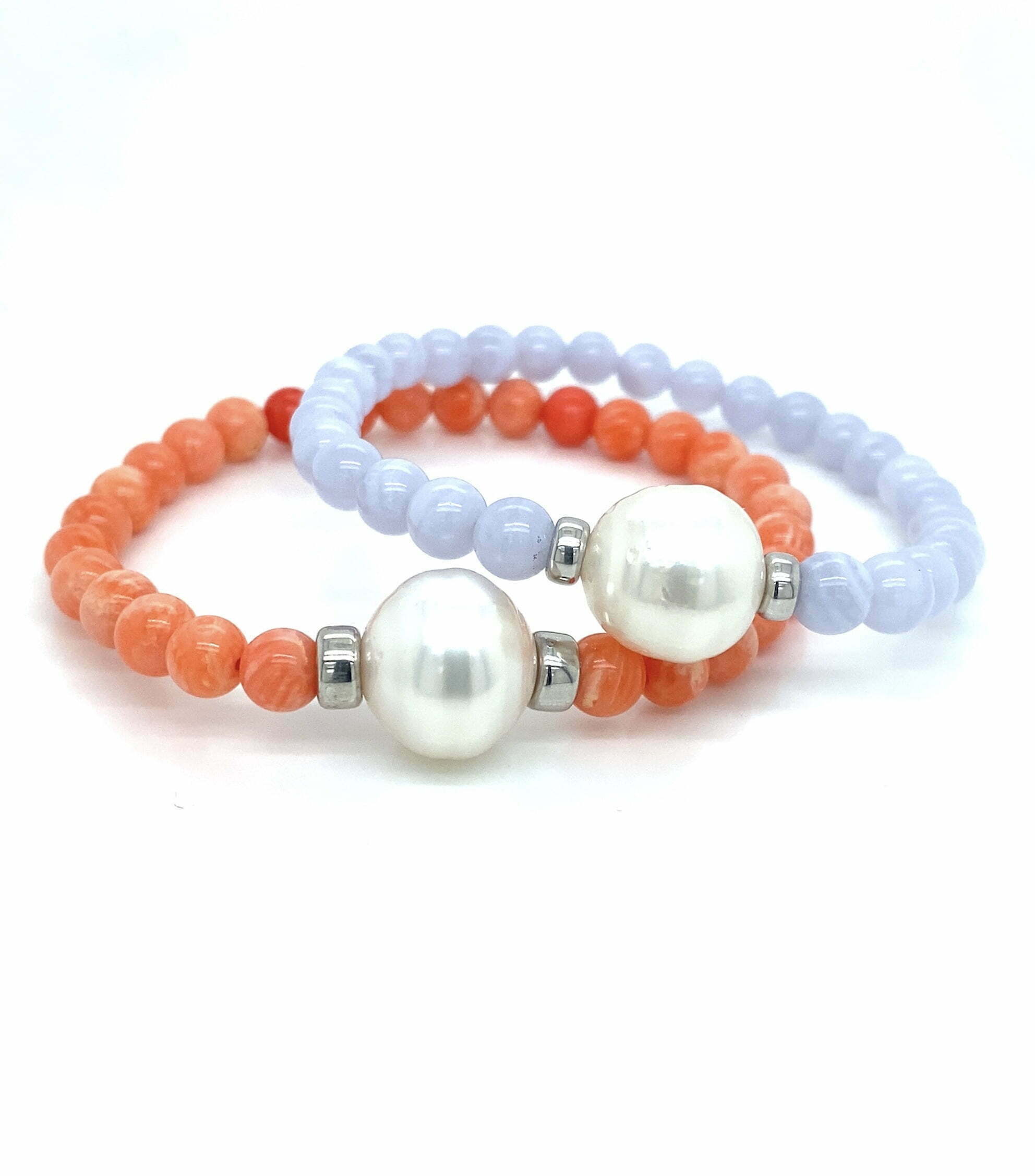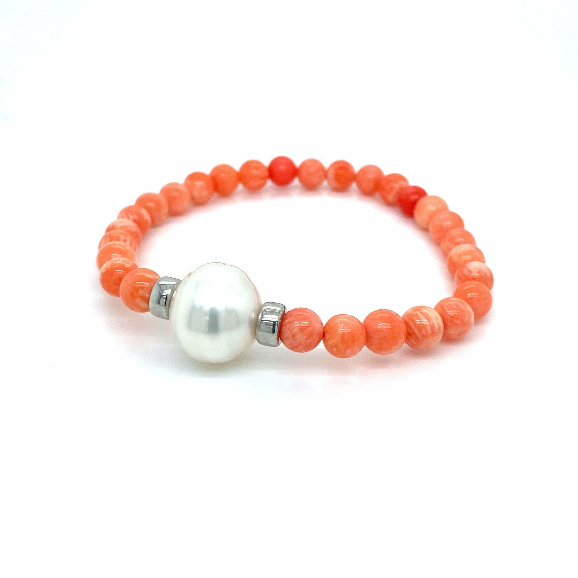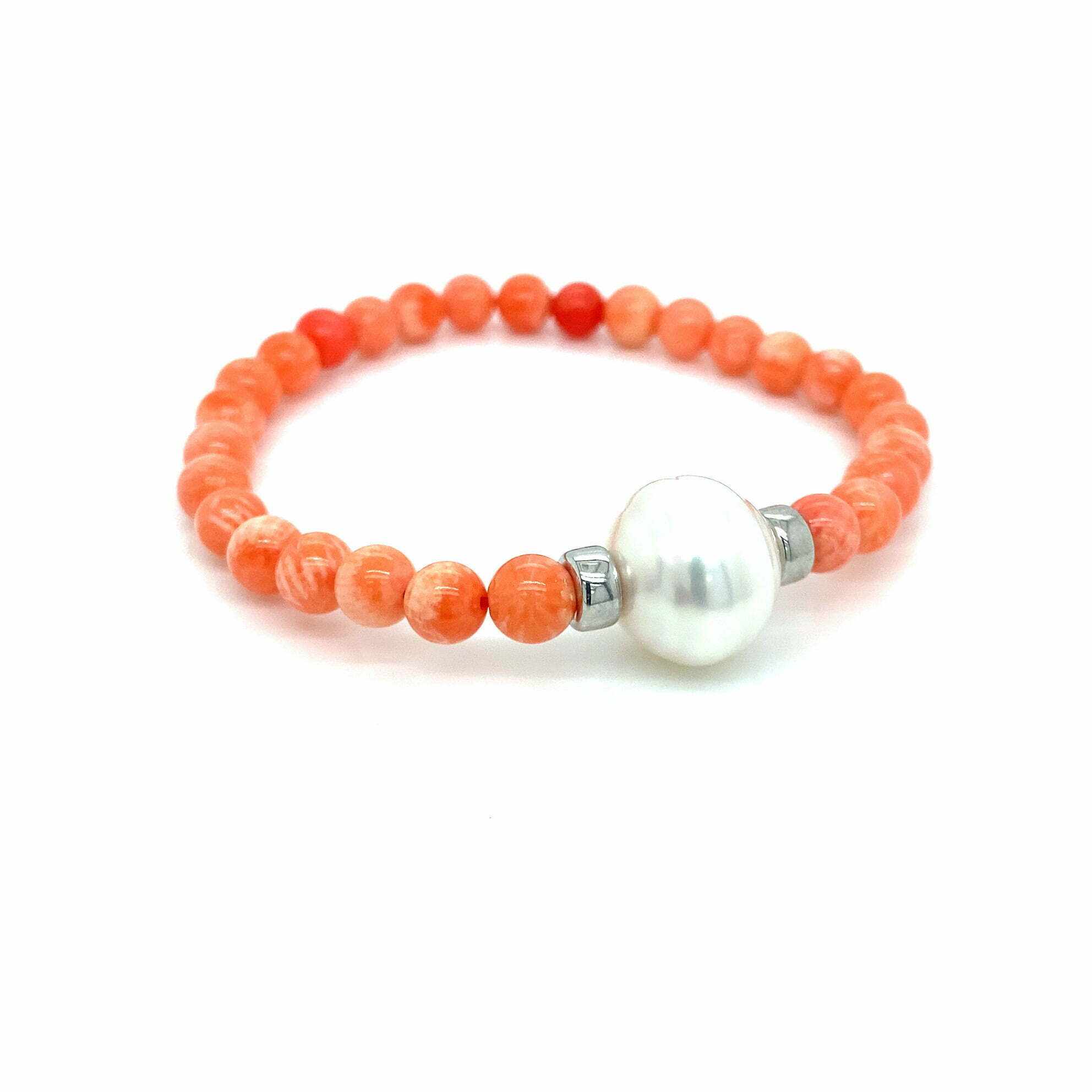 One Australian South Sea cultured pearl with two 14ct white gold rondels and polished round orange coral beads. The bracelet is strung on multiple strands of strong elastic.